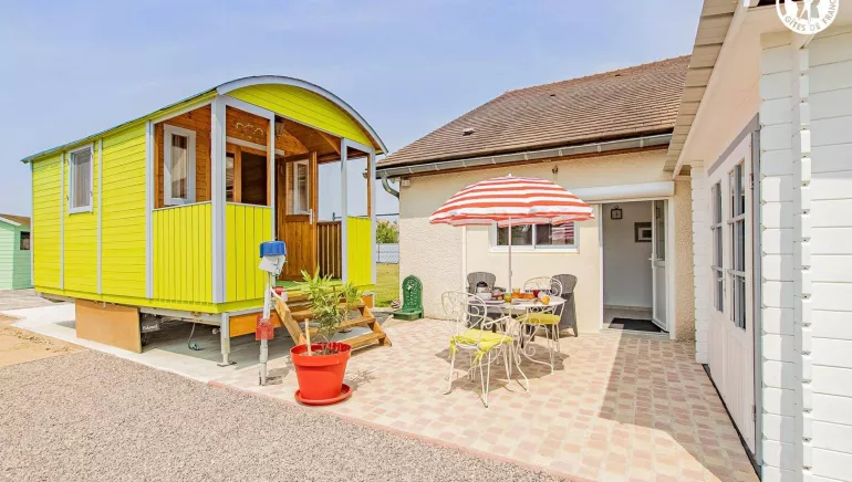 Marie-Claude & Christian vous accueillent au sein d'une insolite roulotte jouxtant leur charmant pavillon "eighties", en toute intimité, sur une belle propriété de 5000m², soigneusement engazonnée, végétalisée, fleurie & arborée, sise en pleine douce campagne péri-urbaine chalonnaise, sur le tracé même de diverses Voies Vertes (longeant la maison), au creux du Val de Saône, apaisant écrin préservé mixant viticulture, agriculture & pleine nature. Calme & totale tranquillité, blotti en lisière de champs & prairies boisées au sein d'un paisible hameau rural résidentiel, aux confins d'un petit bourg commerçant, à deux pas d'une vaste forêt domaniale parsemée d'étangs, littéral "poumon vert" du territoire accolé à un immense ensemble d'espaces forestiers sauvages encerclant Chalon-sur-Saône (à parcourir lors de reposantes balades à pied ou VTT), en toute proximité des rives de la Saône (paradis des pêcheurs & autres kayakistes, espace naturel en large partie protégé en Zone Natura 2000 & ZNIEFF pour ses richesses floristiques et faunistiques). Atypique roulotte colorée d'esprit bohème au chaleureux cachet campagnard boisé, littéral "cocon" cosy & douillet très enveloppant, complétée à "son pied" par une très confortable annexe aménagée en version "appartement d'hôtes". Agréable spacieuse terrasse privative sans vis-à-vis, exposée & ombragée.