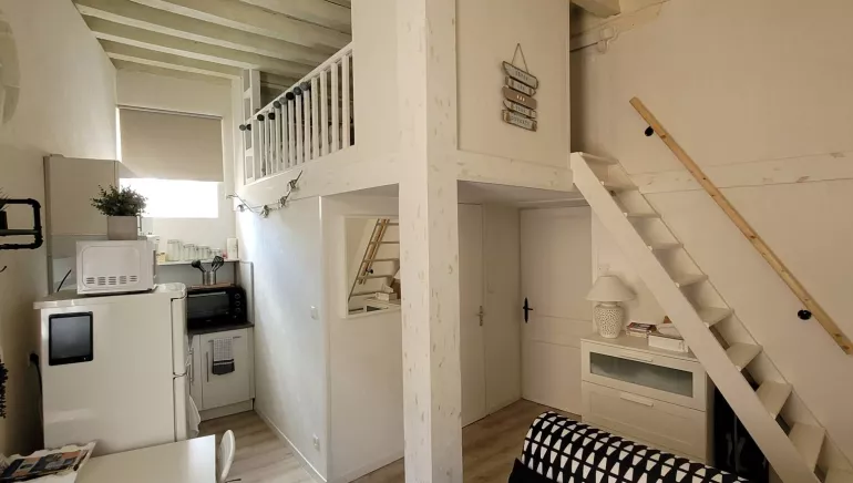 En montant les escaliers, vous accéderez à la mezzanine où se trouve le coin nuit. Il y a un lit de 130 cm et suffisamment d'espace pour ranger vos affaires. La mezzanine est accessible par une échelle, très cosy du fait de la petite hauteur sous plafond ce qui ajoute du charme et de l'originalité à l'appartement.