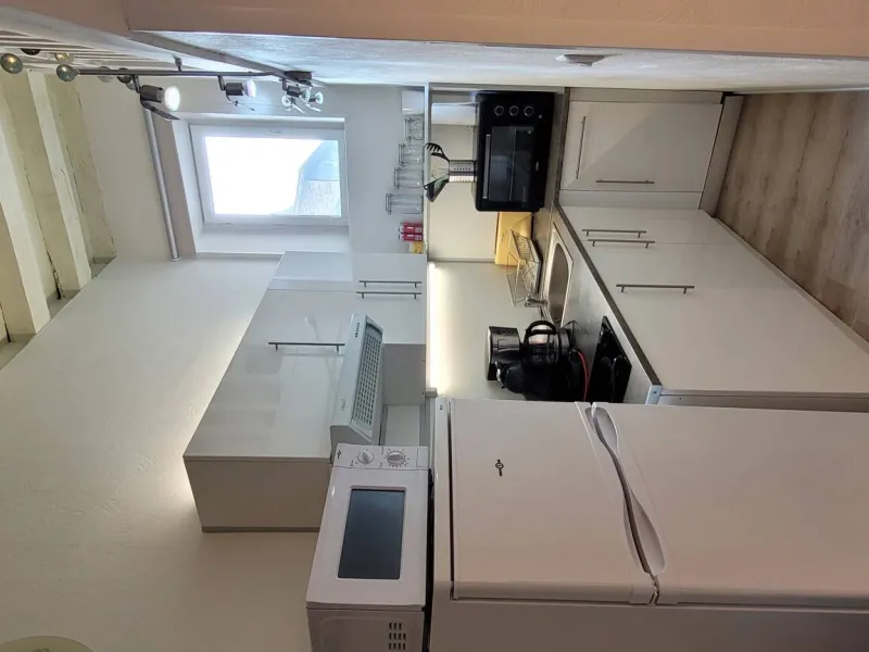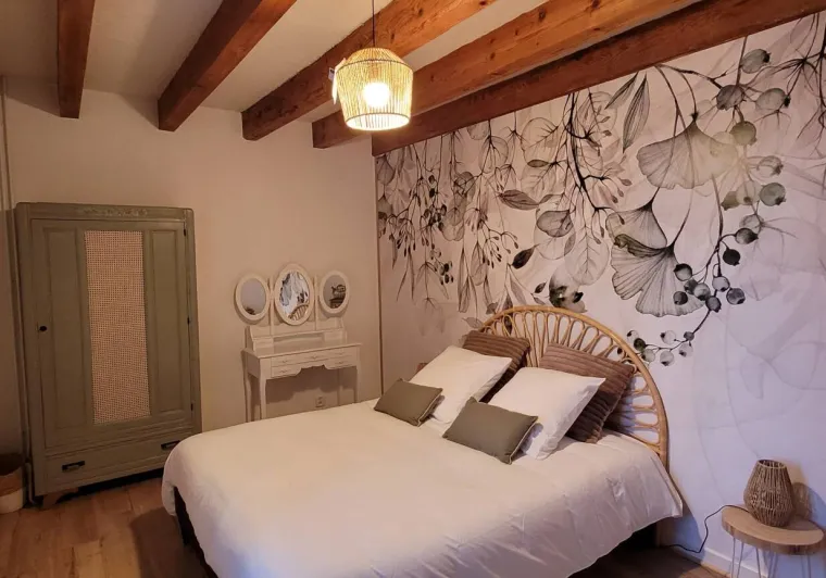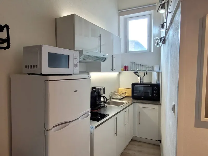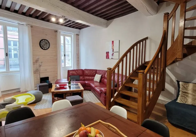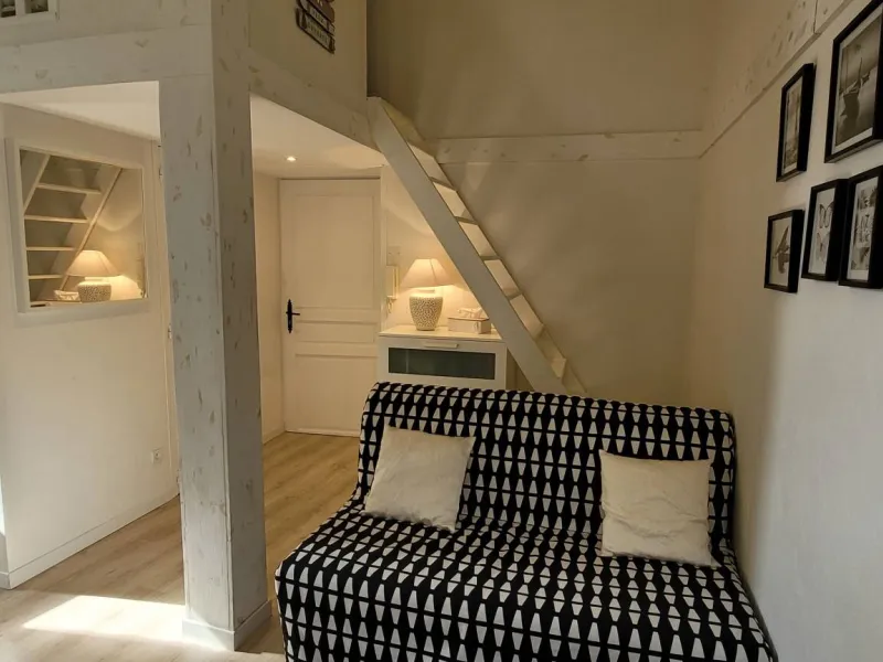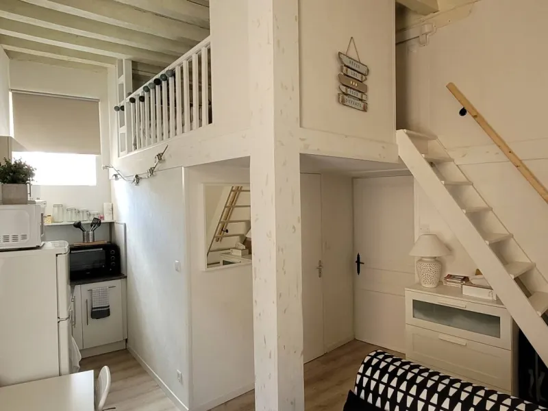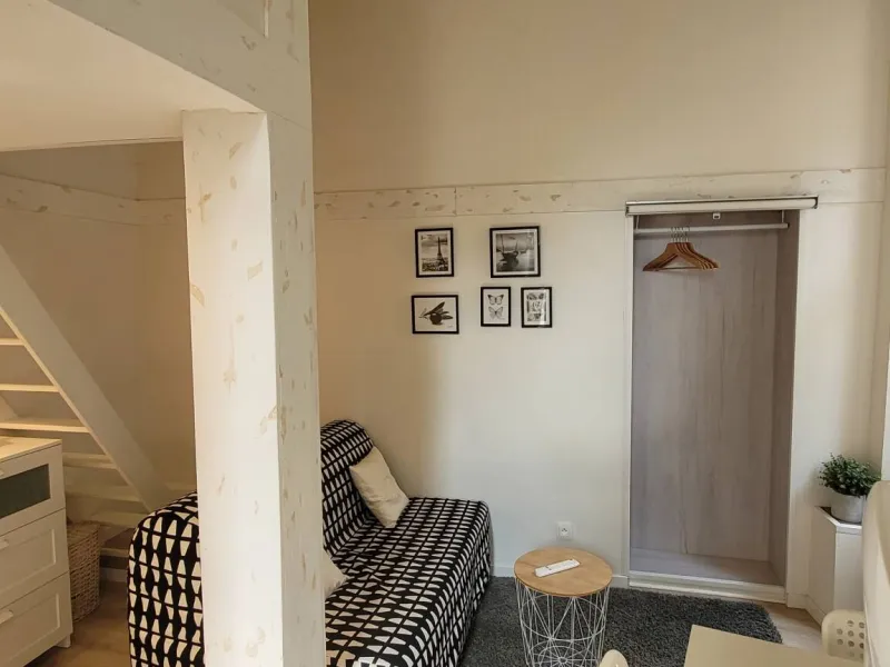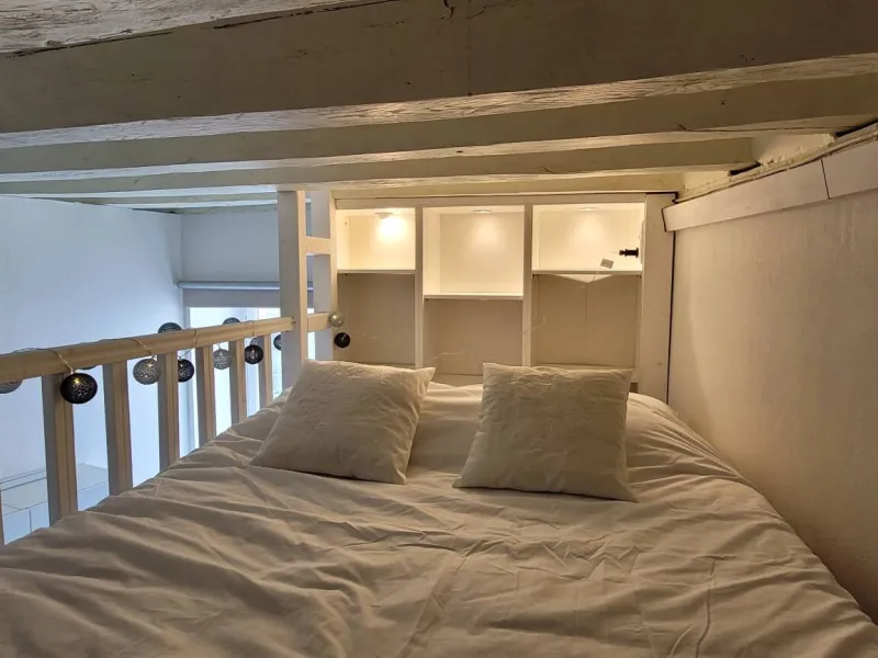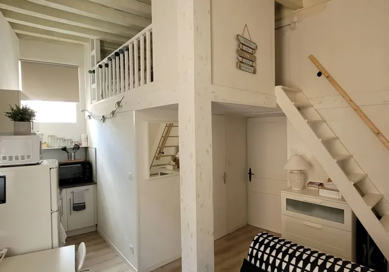 L'appartement est aménagé sur deux niveaux. Au rez-de-chaussée, vous trouverez un coin salon avec un canapé convertible, une petite table, un TV et une kitchenette équipée d'un réfrigérateur, d'un four micro-ondes, d'une plaque de cuisson et d'une cafetière. Il y a également une salle de bains avec une douche et des toilettes.En montant les escaliers, vous accéderez à la mezzanine où se trouve le coin nuit. Il y a un lit de 130 cm et suffisamment d'espace pour ranger vos affaires. La mezzanine est accessible par une échelle, très cosy du fait de la petite hauteur sous plafond ce qui ajoute du charme et de l'originalité à l'appartement.